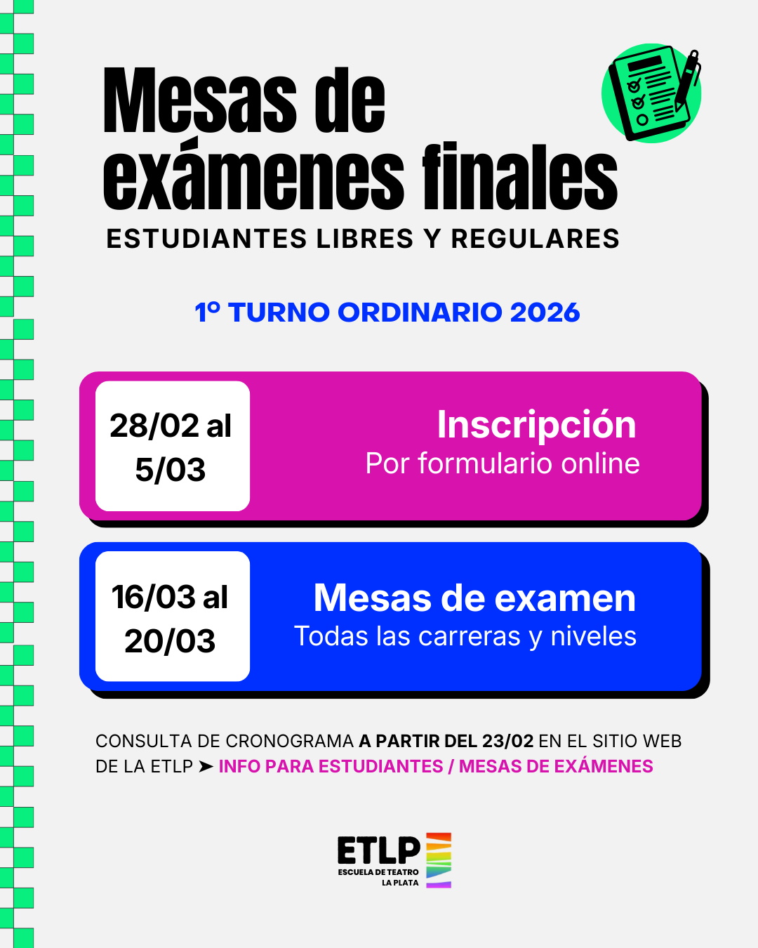 CONSULTÁ EL CRONOGRAMA DE MESAS ACÁ Cronograma sujeto a cambios, solicitamos revisarlo diariamente. Formularios de inscripción Profesorado de Teatro Tecnicatura en Actuación FoBa Escenografía FoBa Maquillaje FoBa Vestuario Tecnicatura en Escenografía Tecnicatura en Maquillaje Tecnicatura en Vestuario