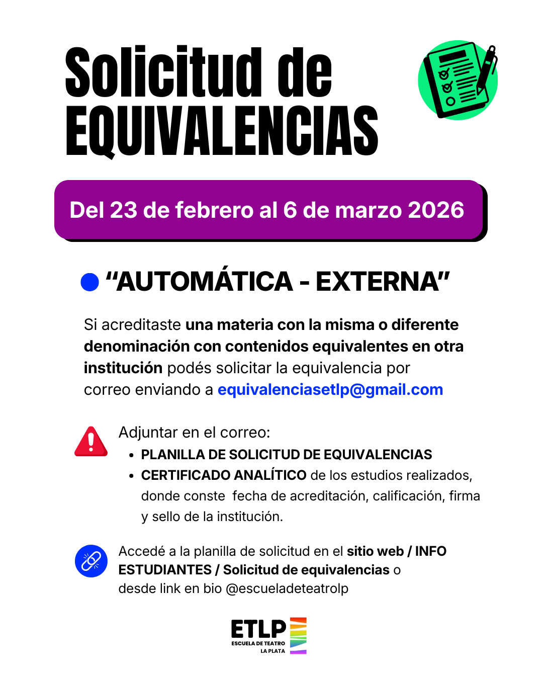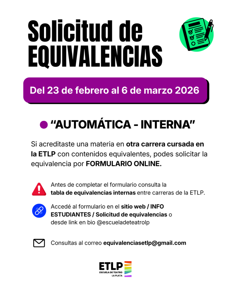Si acreditaste una materia con la misma denominación en otra institución  podes solicitar la equivalencia del 23/2 al 6/03 de 2026 por correo electrónico,  enviando  a  equivalenciasetlp@gmail.com adjuntando la siguiente documentación: